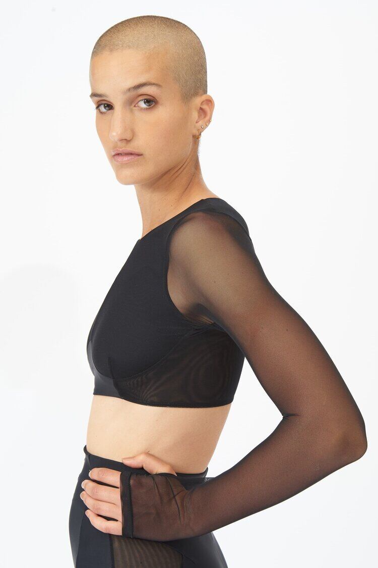 シースルーな袖とセミシースルーな背面が特徴的なコルセット効果のあるクロップトップ。透明なチュールとストレッチ性のあるマットなライクラ生地が組み合わされており、二重構造のフロントサイドと縫い目は動きを妨げることなくしっかりとサポートします。