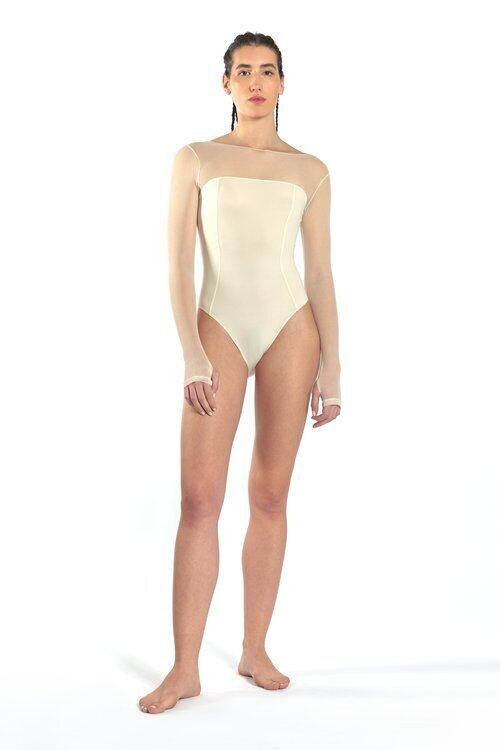 包み込むようにあなたの身体にフィットし、柔らかい肌触りながら丈夫な一品で、90年代のミニマルデザインを彷彿とする肩と腕の透け感が特徴的なストレートカットのボディスーツ。